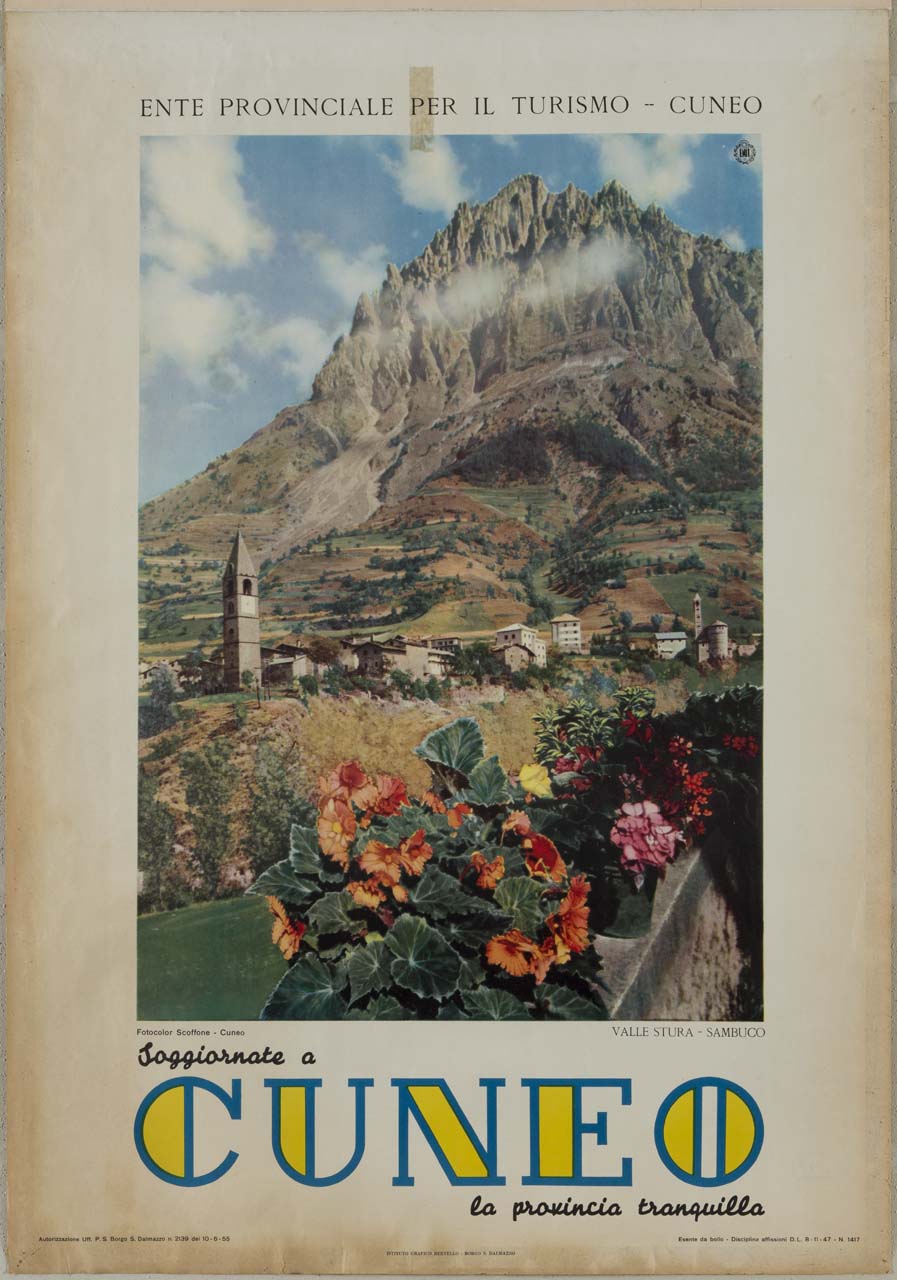 Lettura iconografica: fotografia; veduta di città; due campanili; abside di chiesa; montagna; muretto; vasi di fiori. Categoria merceologica/ tipo evento: turismo; montagna; enti di promozione turistica. Nomi: ENIT; Ente Nazionale per l'incremento delle Industrie Turistiche; Ente Provinciale per il Turismo di Cuneo; Alpi Cozie; Monte Bersaio; Campanile di S. Bartolomeo; Chiesa della Madonna del Roccasio. Luoghi: Valle Stura; Clauzio; Sambuco; Cuneo