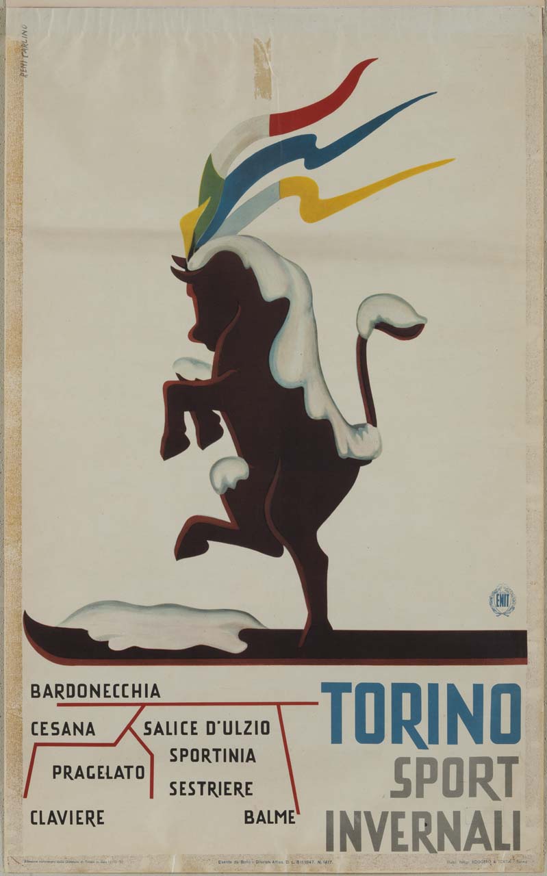 Lettura iconografica: toro; simbolo città di Torino; tre nastri; tricolore italiano; azzurro compagnie sportive; giallo-oro stemma comunale; località. Categoria merceologica/ tipo evento: sport; manifestazioni sportive; sport invernali; turismo; enti di promozione turistica. Nomi: ENIT; Ente Nazionale per l'incremento delle Industrie Turistiche; Torino Sport Invernali. Luoghi: Bardonecchia; Cesana Torinese; Sportinia; Salice d’Ulzio; Sauze d’Oulx; Pragelato; Sestriere; Claviere; Balme; Torino