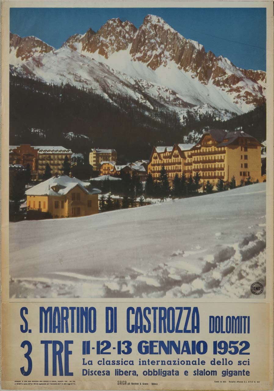 Lettura iconografica: veduta di città; alberghi; neve; montagne. Categoria merceologica/ tipo evento: turismo, montagna; enti di promozione turistica; sport; sci; gare di sci; manifestazioni sportive; discesa libera; discesa obbligata; slalom gigante. Nomi: ENIT; Ente Nazionale per l'incremento delle Industrie Turistiche; EPT; Ente di Promozione Turistica di Trento; 3 Tre; la classica internazionale dello sci; Dolomiti; pale di San Martino. Luoghi: Valle del Primiero; San Martino di Castrozza; Sior; Tonadico; Trento