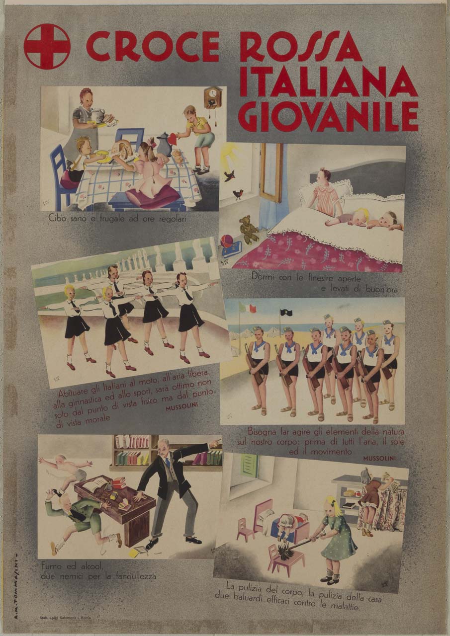 Lettura iconografica: figure maschili; figure femminili; giovani; bambini; famiglia; scuola; interno domestico; spiagge; alimentazione; sport; educazione; igiene; salute. Categoria merceologica/ tipo evento: sanità; organizzazioni associative; croce rossa italiana; informazione e comunicazione; propaganda fascista. Nomi: Croce Rossa Italiana Giovanile; piccole italiane; avanguardisti; Benito Mussolini. Luoghi: Italia