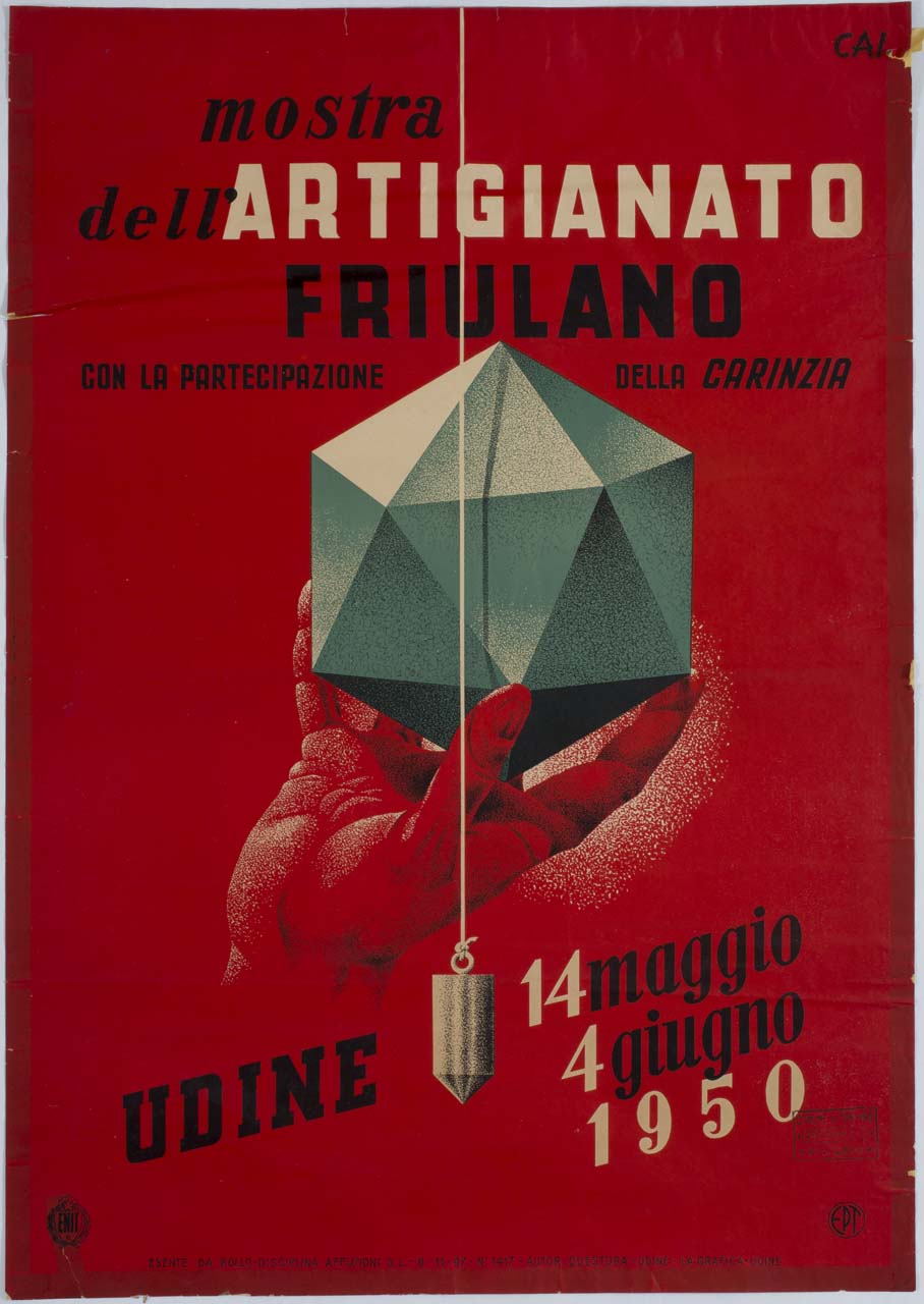 Lettura iconografica: mano maschile; prisma; filo a piombo. Categoria merceologica/ tipo evento: artigianato; mostre; enti di promozione turistica. Nomi: Mostra dell'Artigianato friulano; ENIT; Ente Nazionale per l'incremento delle Industrie Turistiche; EPT; Ente Provinciale per il Turismo di Udine. Luoghi: Udine; Austria; Carinzia