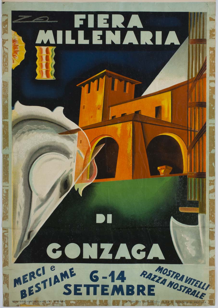 Lettura iconografica: architetture; torre; testa di cavallo; fascio littorio; lanternine. Categoria merceologica/ tipo evento: commercio; industria; artigianato; agricoltura; allevamento; bovini; fiere. Nomi: Fiera millenaria di Gonzaga; Mostra vitelli razza nostrale; Torre Piccola. Luoghi: Mantova; Gonzaga