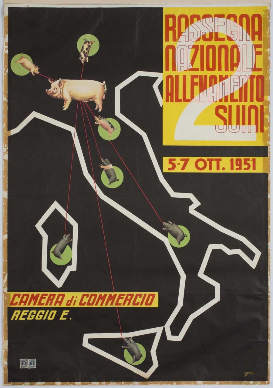 2 Rassegna nazionale allevamento suini. carta geografica dell'Italia con suini collegati tra loro da linee rosse
