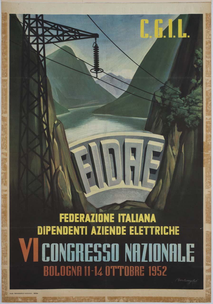 Lettura iconografica: paesaggio montano; montagne; fiume; diga; traliccio; cavi dell'alta tensione. Categoria merceologica/ tipo evento: sindacato; organizzazioni sindacali; congressi. Nomi: VI Congresso nazionale; FIDAE; Federazione italiana dipendenti aziende elettriche; CGIL; Confederazione Generale Italiana del Lavoro. Luoghi: Bologna