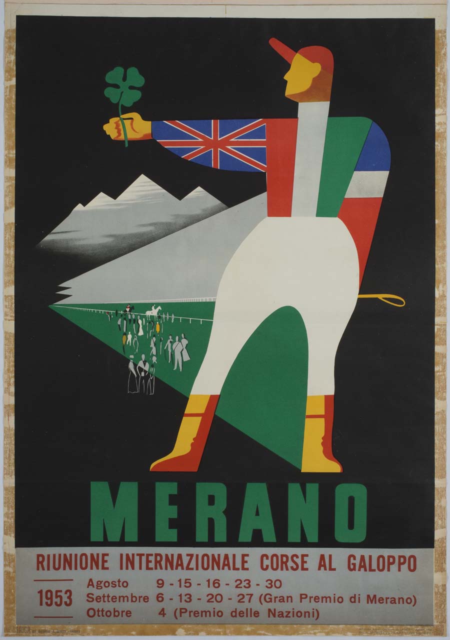 Lettura iconografica: fantino; quadrifoglio; bandiere mondiali; ippodromo; figure; montagne. Categoria merceologica/ tipo evento: sport; gare; ippica. Nomi: Riunione Internazionale corse al galoppo; Gran Premio di Merano; Premio delle Nazioni. Luoghi: Bolzano; Merano