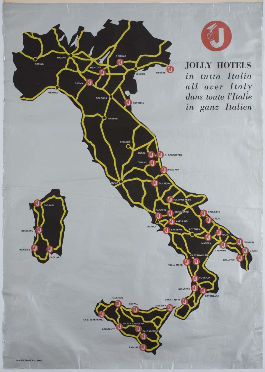 Lettura iconografica: carta geografica; Italia. Categoria merceologica/ tipo evento: turismo; hotel; associazioni di promozione turistica; associazioni professionali. Nomi: Jolly Hotels. Luoghi: Italia; Vicenza; Valdagno; Torino; Milano; Mantova; Vicenza; Venezia; Trieste; Parma; Genova; Bologna; Ravenna; Firenze; Perugia; Ascoli; San Benedetto; Teramo; Pescara; Roma; Sulmona; Campobasso; Caserta; Benevento; Barletta; Avellino; Trani; Napoli; Salerno; Potenza; Gioia del Colle; Matera; Brindisi; Taranto; Lecce; Gallipoli; Castrovillari; Praia a Mare; Cosenza; Nicastro; Catanzaro; Gioia Tauro; Messina; Palermo; Cefalù; Castelvetrano; Agrigento; Piazza Armerina; Caltagirone; Ragusa; Sassari; Oristano; Iglesias; Cagliari