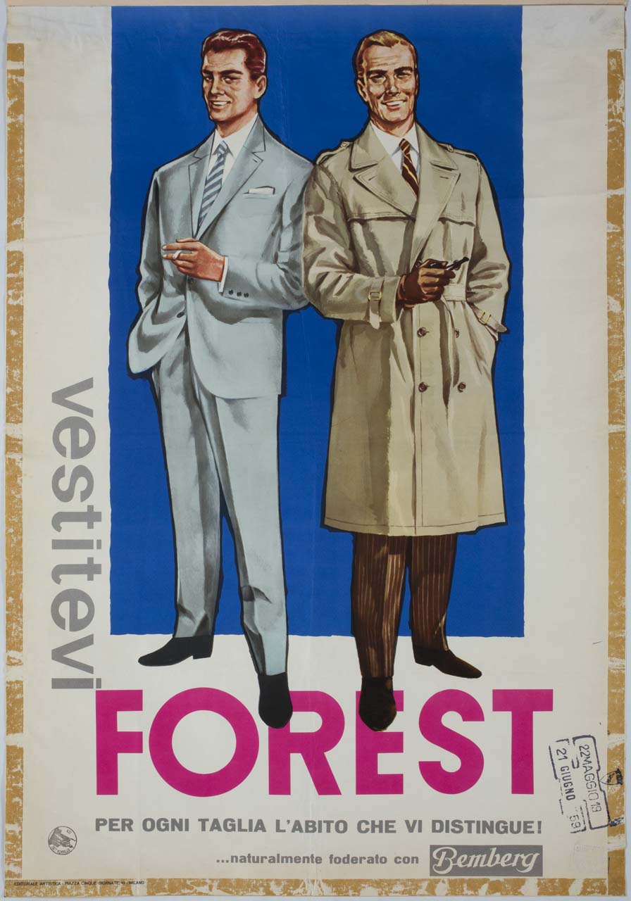 - NOTIZIE STORICO CRITICHE La datazione proposta fa riferimento come termine ante quem all'iscrizione presente sul manifesto. La ditta di abbigliamento Forest S.p.A. fu fondata a Pisa negli anni Cinquanta del Novecento da Foresto Bargi; la Società Bemberg di Gozzano (Novara), azienda nata nel 1926, era specializzata nella produzione di filati e tessuti artificiali