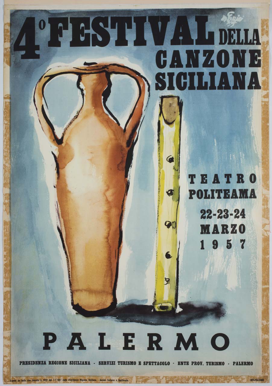 Lettura iconografica: anfora; flauto a becco. Categoria merceologica/ tipo evento: manifestazioni culturali; festival musicale; amministrazione pubblica; enti locali; amministrazione regionale; enti di promozione turistica. Nomi: 4 Festival della Canzone Siciliana; friscalettu; Teatro Politeama; Presidenza Regione Siciliana; Servizi Turismo e Spettacolo; Ente Provinciale Turismo di Palermo. Luoghi: Sicilia; Palermo