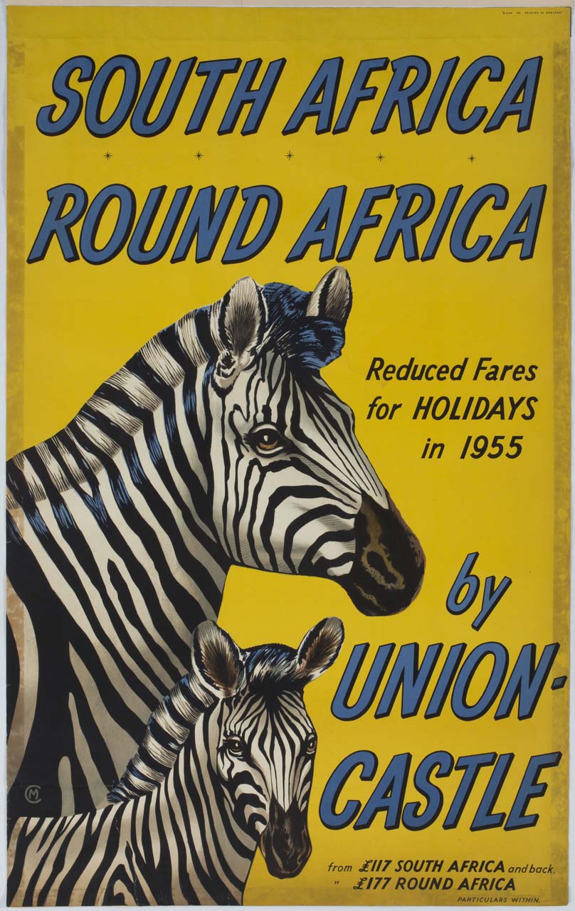 Lettura iconografica: zebre; cucciolo. Categoria merceologica/ tipo evento: trasporti; trasporto marittimo; compagnia di navigazione; turismo. Nomi: Union-Castle Line; Union-Castle Mail Steamship Company. Luoghi: Inghilterra; Southampton; South Africa; Sud Africa