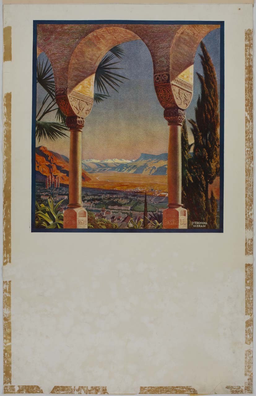 Lettura iconografica: loggia; veduta di città; veduta di Merano; paesaggio alpino. Categoria merceologica/ tipo evento: turismo; montagna. Luoghi: Bolzano; Merano