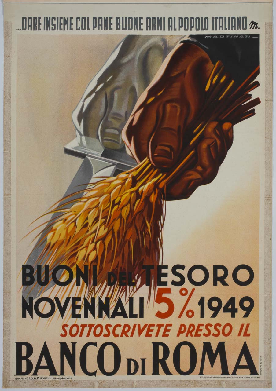 Lettura iconografica: mani; spada; spighe di grano. Categoria merceologica/ tipo evento: guerra; Seconda guerra mondiale; attività finanziarie e assicurative; banche; buoni del Tesoro; informazione e comunicazione; propaganda bellica. Nomi: Banco di Roma; Buoni del Tesoro Novennali 5% 1949; Benito Mussolini. Luoghi: Roma