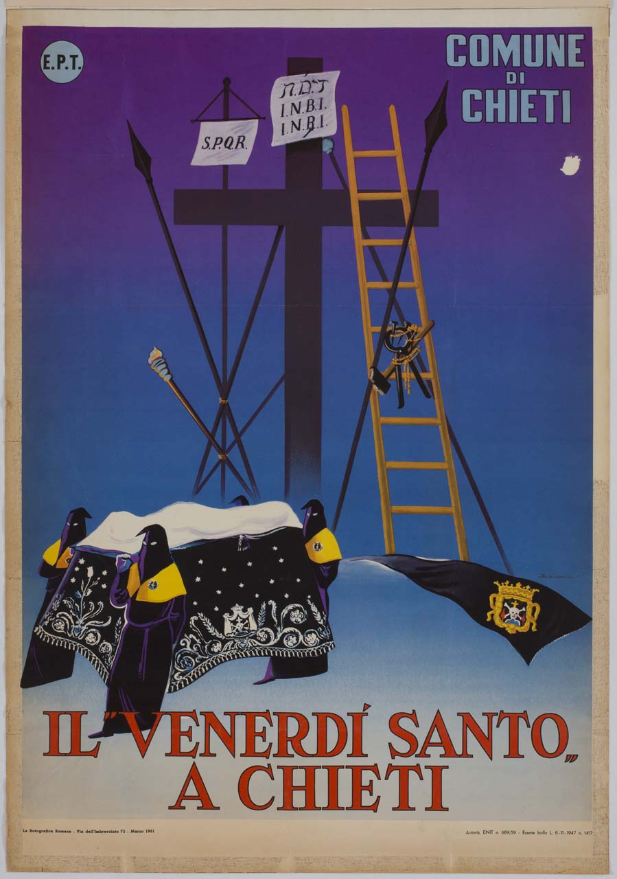 Lettura iconografica: figure maschili; incappucciati; catafalco; croce; strumenti della passione; lancia; spugna; tenaglia; martello; chiodi; corda; torcia; titulus crucis. Categoria merceologica/ tipo evento: religione cattolica; processione del Venerdì Santo; turismo; enti di promozione turistica; amministrazione pubblica; enti locali; amministrazione comunale. Nomi: EPT; Ente Provinciale per il Turismo; Comune di Chieti. Luoghi: Chieti