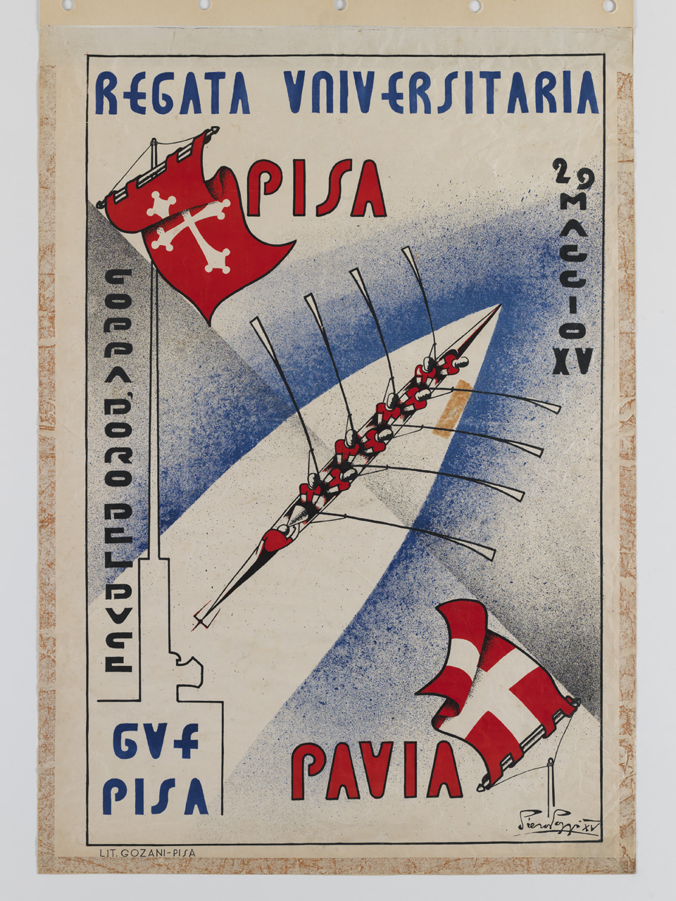 Lettura iconografica: imbarcazione; remi; regata; figure maschili; vogatori; bandiere rosse con croce bianca; acqua. Categoria merceologica/ tipo evento: sport; manifestazioni sportive; canottaggio; istruzione; università; politica; partiti politici; associazioni studentesche. Nomi: Coppa d'oro del Duce; Regata Universitaria; GUF; Gruppi Universitari Fascisti; Benito Mussolini. Luoghi: Pavia; Pisa