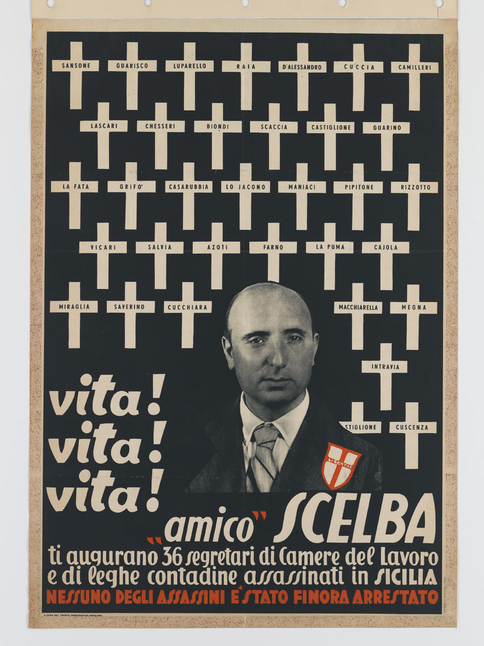 Lettura iconografica: figura maschile; ritratto; politico; croci. Categoria merceologica/ tipo evento: informazione e comunicazione; propaganda politica; propaganda antidemocristiana; politica; partiti politici. Nomi: Fronte Democratico Popolare; DC; Democrazia Cristiana; Mario Scelba; Sansone; Guarisco; Luparello; Raia; D'alessandro; Cuccia; Camilleri; Lascari; Chesseri; Biondi; Scaccia; Castiglione; Guarino; La Fatta; Grifò; Casarubbia; Lo Jacono; Maniaci; Pipitone; Rizzotto; Vicari; Salvia; Azoti; Farno; La Puma; Cajola; Miraglia; Saverino; Cucchiara; Macchiarella; Negna; Intravia; Stiglione; Cuscenza. Luoghi: Sicilia