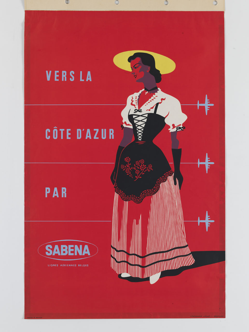 - NOTIZIE STORICO CRITICHE Negli anni Cinquanta, Sabena - la compagnia di bandiera belga fondata nel 1923 e in attività fino al 2001 - realizzò una serie di manifesti pubblicitari impostati come il presente: sullo sfondo a destra si stagliano i piccoli aerei con la rotta segnata e in primo piano la figura in abiti tradizionali a seconda della destinazione
