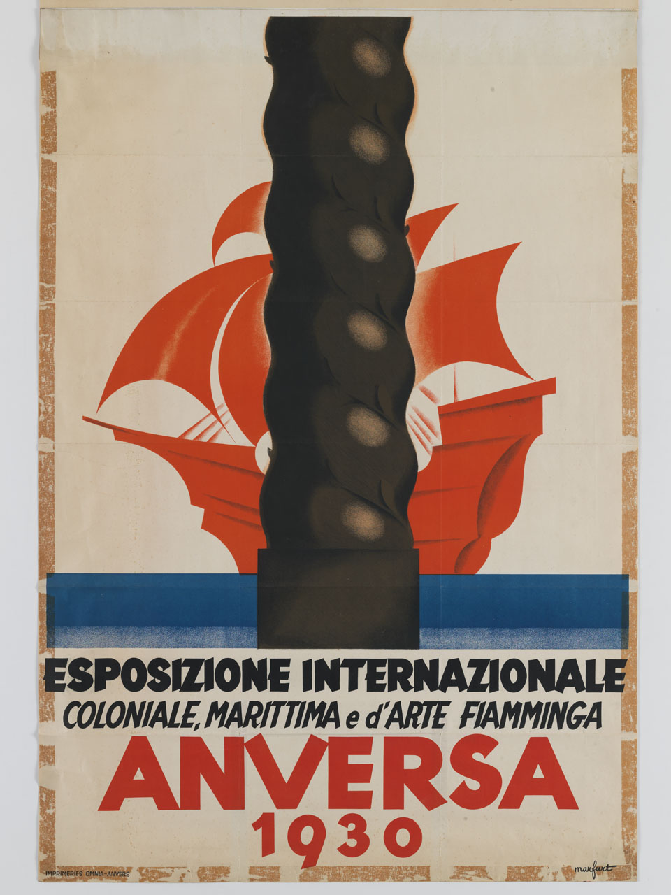 Lettura iconografica: colonna; nave; galeone. Categoria merceologica/ tipo evento: commercio; industria; artigianato; agricoltura; fiere; manifestazioni culturali; esposizione d'arte. Nomi: Esposizione Internazionale Coloniale Marittima e d'Arte Fiamminga. Luoghi: Belgio; Fiandre; Anversa