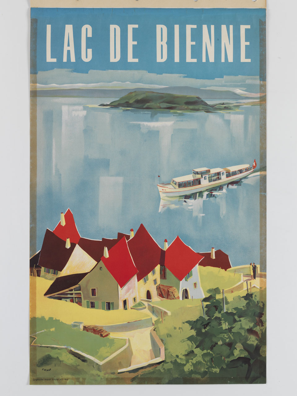 Lettura iconografica: veduta; Lago di Bienne; barca; traghetto. Categoria merceologica/ tipo evento: turismo; montagna. Luoghi: Svizzera; Canton Berna; Bienne