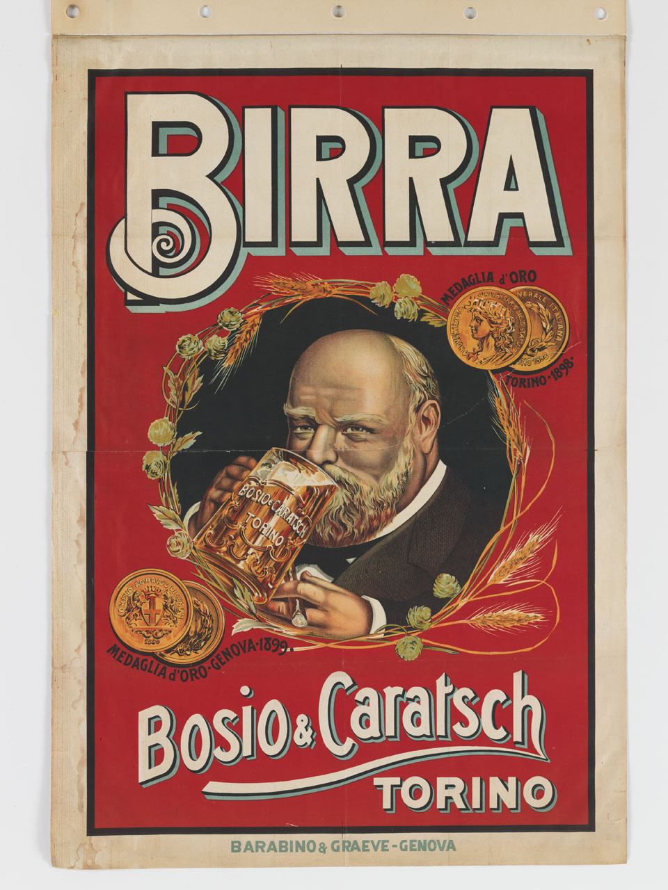Lettura iconografica: figura maschile; birra; boccale; sigaro; orzo; spighe; luppolo; medaglie. Categoria merceologica/ tipo evento: industria alimentare; bevande; birra. Nomi: Bosio & Caratsch. Luoghi: Torino