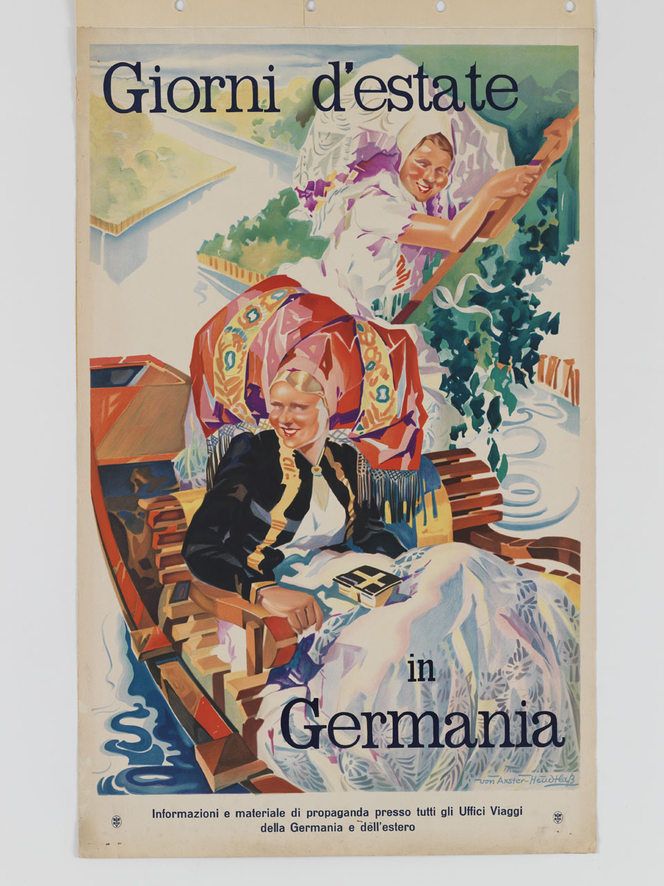 Lettura iconografica: figure femminili; abito tradizionale; barca; fiume. Categoria merceologica/ tipo evento: turismo; enti di promozione turistica; agenzie di viaggio. Nomi: Germania; Reichsbahnzentrale für den Deutschen Reiseverkehr