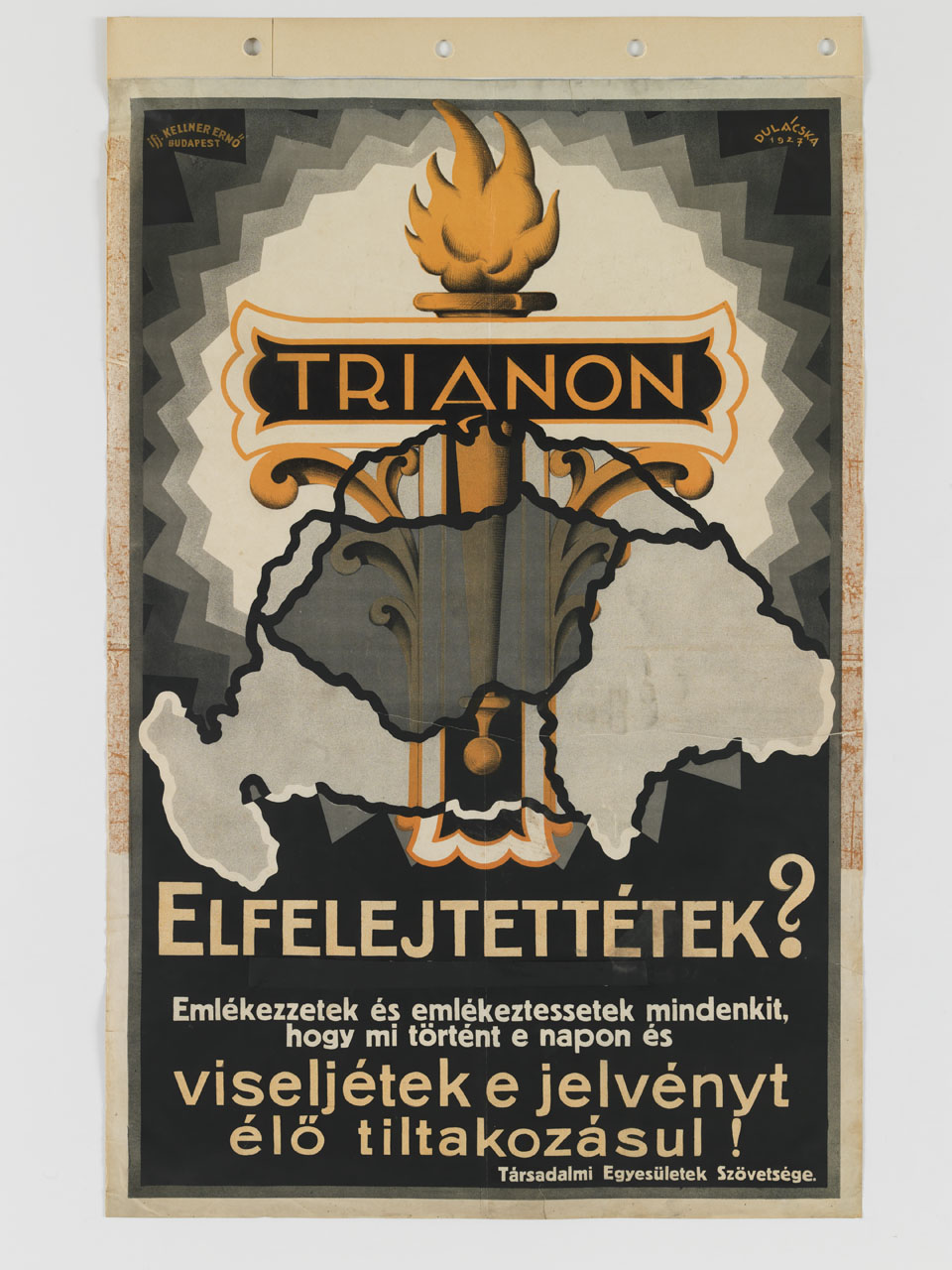 - NOTIZIE STORICO CRITICHE Il manifesto invita a ricordare le conseguenze del trattato del Trianon con cui le potenze vincitrici della Prima guerra mondiale stabilirono le sorti del Regno d'Ungheria in seguito alla dissoluzione dell'Impero Austro-Ungarico. Il trattato venne firmato il 4 giugno 1920 nel palazzo del Grande Trianon di Versailles, in Francia. La mappa riprodotta nel manifesto mostra la riduzione del territorio ungherese in conseguenza del trattato