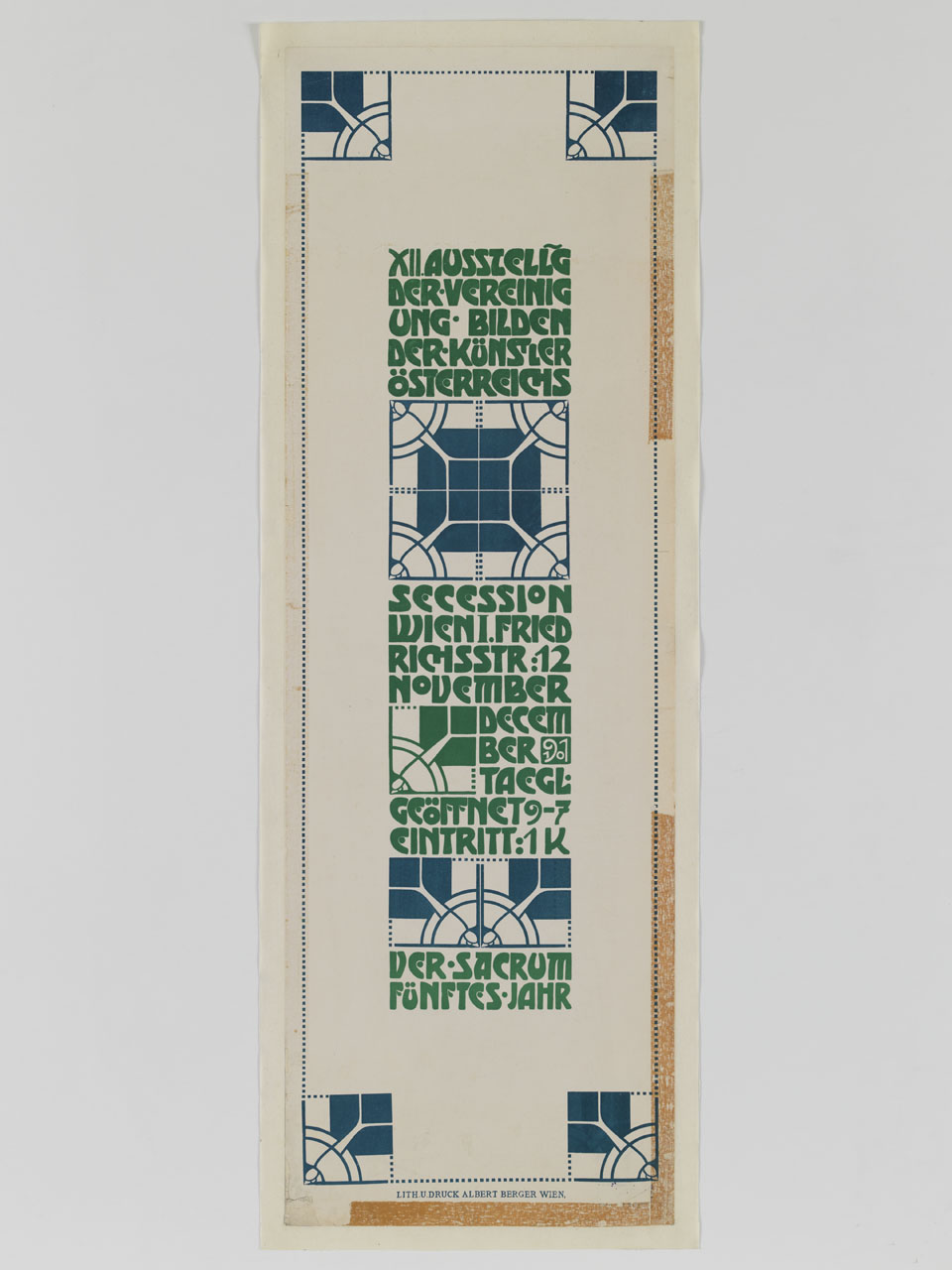 Lettura iconografica: motivi geometrici. Categoria merceologica/ tipo evento: manifestazioni culturali; esposizioni; esposizione d'arte; associazioni culturali; informazione e comunicazione; editoria; periodico mensile; cultura; arte. Nomi: XII Ausstellung der Vereinigung Bildender Künstler Österreichs; Secession; Ver Sacrum. Luoghi: Austria; Vienna