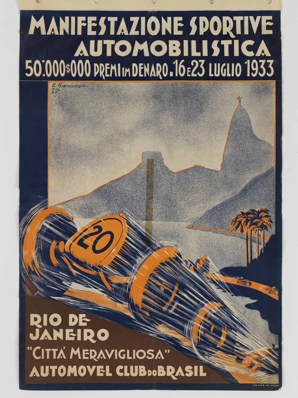 Lettura iconografica: automobili da corsa; paesaggio; baia; strada; mare; palme; collina; silhouette. Categoria merceologica/ tipo evento: sport; automobilismo; manifestazioni sportive; associazioni sociali. Nomi: Manifestazione Sportive Automobilistica; Automovel Club do Brasil; Pan di Zucchero. Luoghi: Brasile; Rio de Janeiro