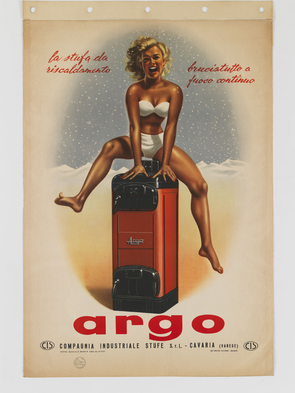 Lettura iconografica: figura femminile; bikini; stufa; paesaggio montano. Categoria merceologica/ tipo evento: industria manifatturiera; riscaldamento; stufa a legna. Nomi: Argo; CIS; Compagnia Industriale Stufe. Luoghi: Varese; Cavaria