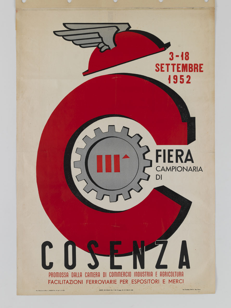 Lettura iconografica: lettera C; elmetto alato; corpicapo; ingranaggi. Categoria merceologica/ tipo evento: fiere; commercio; industria; artigianato; agricoltura; associazioni economiche; trasporti; treni; facilitazioni ferroviarie. Nomi: Fiera Campionaria di Cosenza; Camera di Commercio Industria e Agricoltura di Cosenza; petaso. Luoghi: Italia; Cosenza
