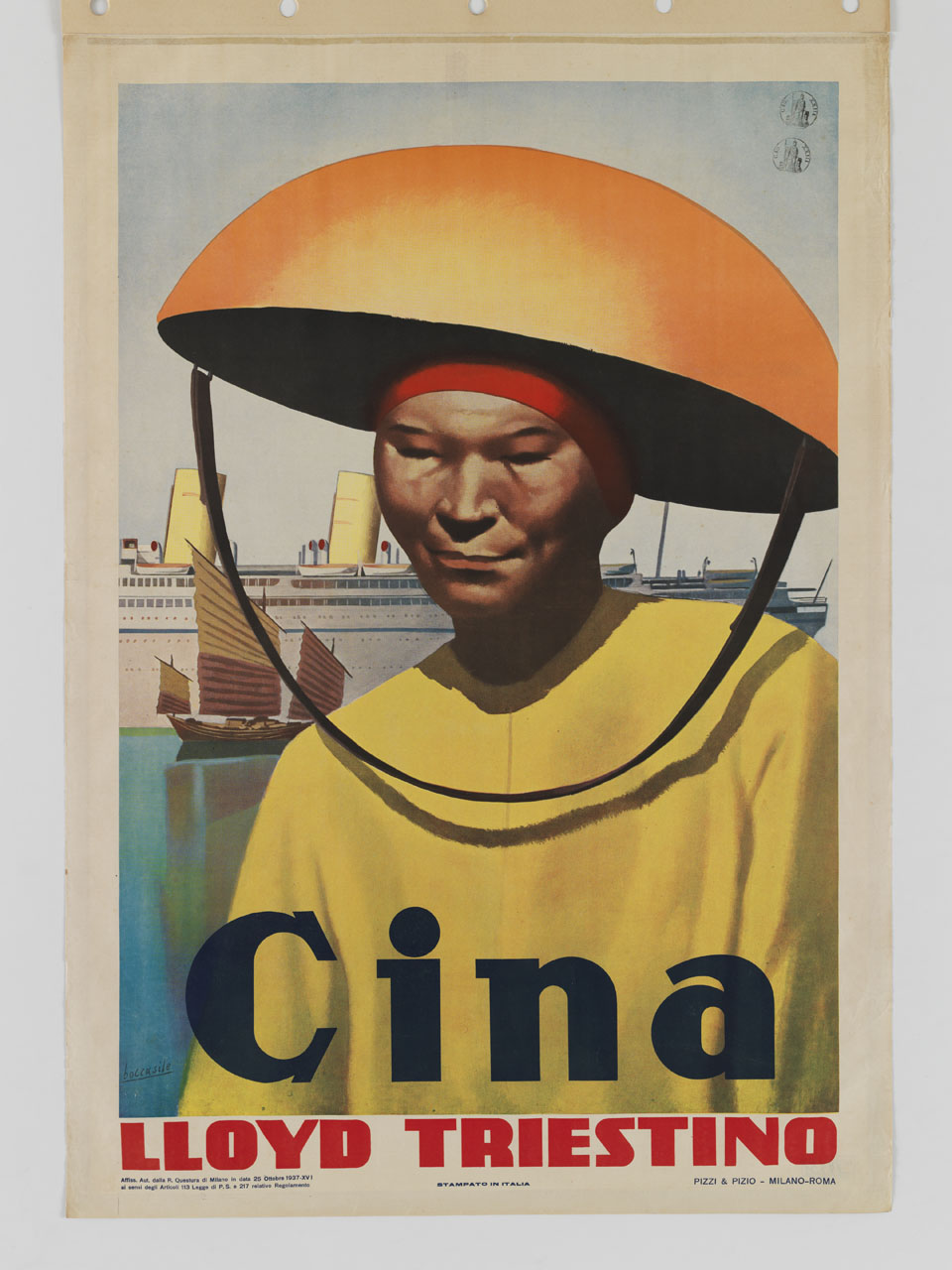 Lettura iconografica: figura maschile; abbigliamento tradizionale; copricapo di paglia; navi; transatlantico; barca a vela; mare. Categoria merceologica/ tipo evento: attività finanziarie assicurative; assicurazioni; trasporti; trasporto marittimo; transatlantico; peschereccio. Nomi: Lloyd Triestino; takuhatsugasa; changshan; Lloyd Triestino; giunca. Luoghi: Italia; Cina