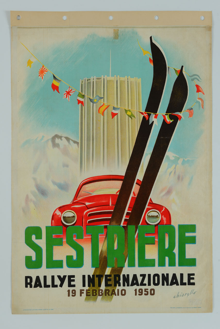 Lettura iconografica: filo con bandiere; sci; automobile; strutture ricettive; albergo; montagne. Categoria merceologica/ tipo evento: sport; gare; rally. Nomi: Rallye Internazionale; Villaggio Olimpico. Luoghi: Sestriere; Torino