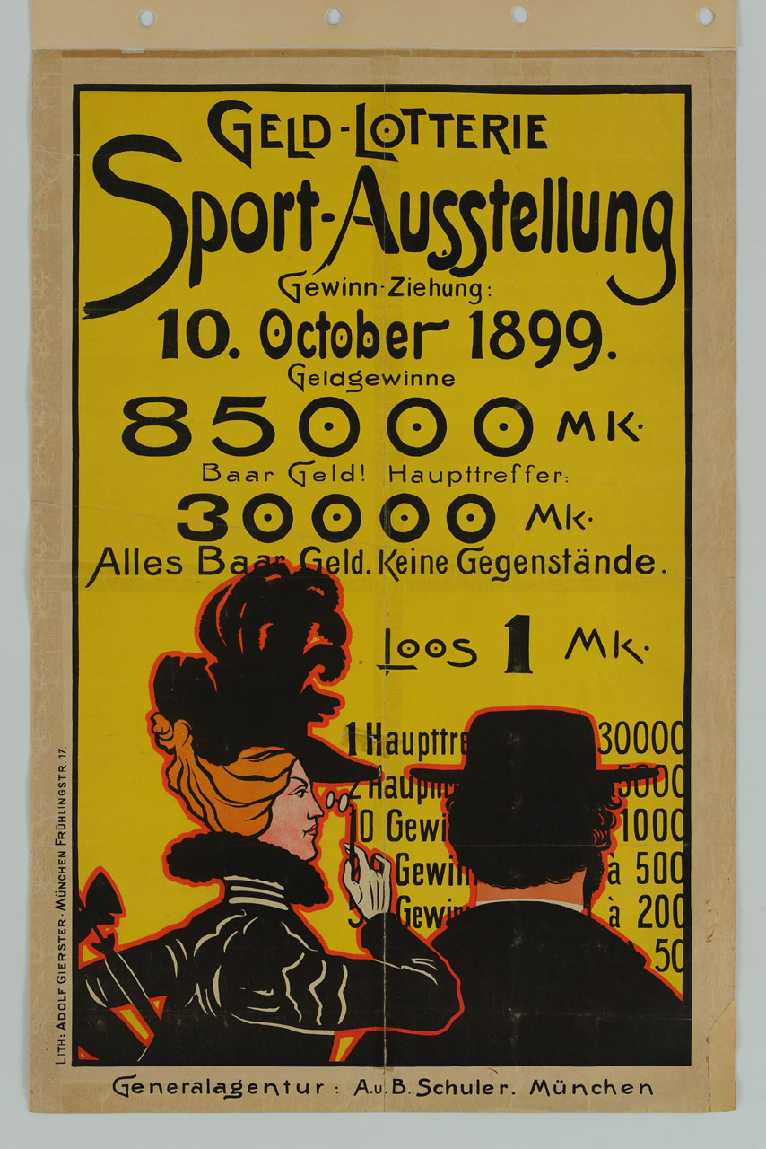 Lettura iconografica: figura femminile; figura maschile; parasole; cappello piumato; occhialini; lorgnette. Categoria merceologica/ tipo evento: sport; manifestazioni sportive; tempo libero; lotteria. Nomi: Geld-Lotterie Sportausstellung