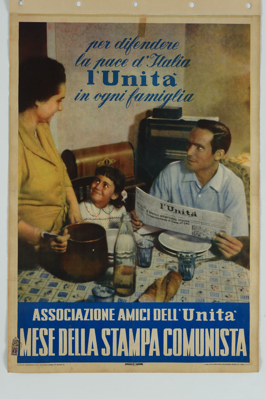 Lettura iconografica: figura femminile; bambina; figura maschile; giornale; tavola; bottiglia; bicchieri; pentola; mestolo; piatti; pane; mobile con radio; consolle. Categoria merceologica/ tipo evento: informazione e comunicazione; editoria; periodico; quotidiano; politica; partiti politici; associazioni. Nomi: L'Unità; P.C.I.; Partito Comunista Italiano; Associazione Amici dell'Unità; Piero Gobetti; Antonio Gramsci; Davide Lajolo; Velio Spano; Mese Stampa Comunista; Ufficio Propaganda della Direzione Generale dell'Unità