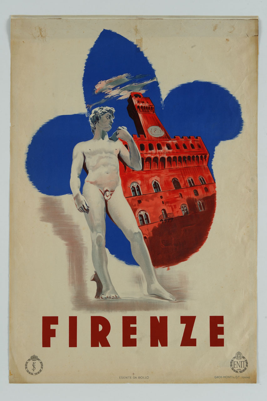 Lettura iconografica: statua; architettura; giglio. Categoria merceologica/ tipo evento: turismo; enti di promozione turistica. Nomi: David; Michelangelo Buonarroti; Palazzo della Signoria; Palazzo Vecchio; Arnolfo di Cambio; giglio fiorentino; giglio bottonato; ENIT; Ente Nazionale per l'incremento delle Industrie Turistiche; Ferrovie dello Stato. Luoghi: Firenze