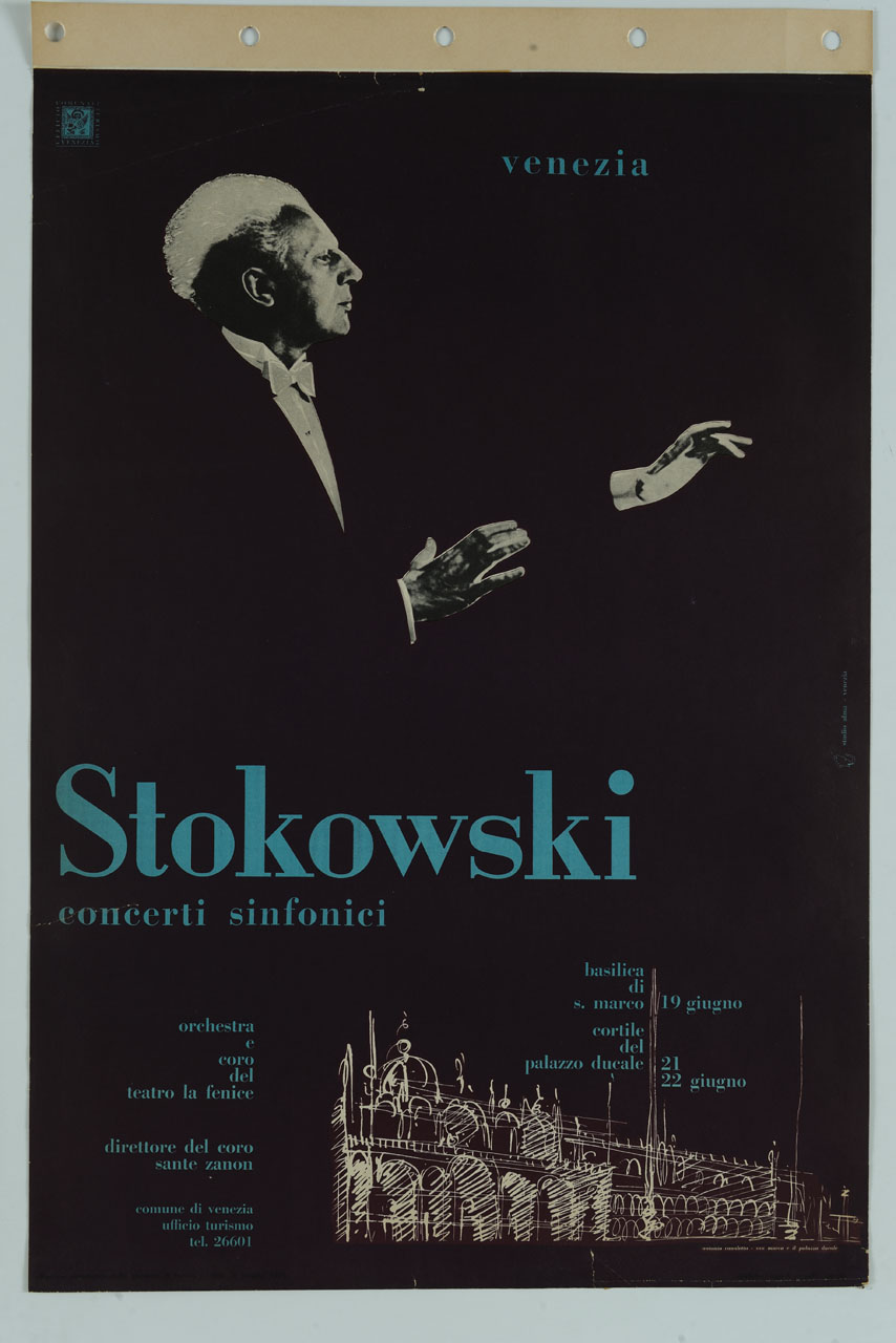 Lettura iconografica: figura maschile; frac; disegno; chiesa; palazzo; disegno. Categoria merceologica/ tipo evento: spettacolo; teatro; musica; concerto sinfonico; enti di promozione turistica. Nomi: Leopold Stokowski; basilica di San Marco; palazzo Ducale; teatro La Fenice; Sante Zanon; comune di Venezia; ufficio turismo; Giovanni Antonio Canal detto il Canaletto; gabinetto dei Disegni e delle Stampe del palazzo Ducale di Venezia. Luoghi: Venezia