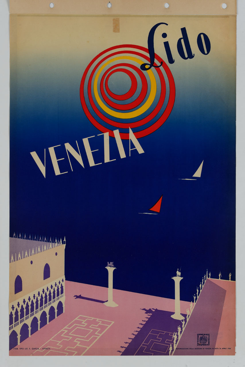 Lettura iconografica: piazza; mare; vela; colonna; statua; palazzo; cerchi concentrici. Categoria merceologica/ tipo evento: turismo; enti di promozione turistica. Nomi: Ufficio comunale turismo; Piazzetta San Marco; bacino di San Marco; colonna di San Marco; colonna di San Todaro; palazzo Ducale; Libreria Marciana. Luoghi: Venezia; Venezia Lido