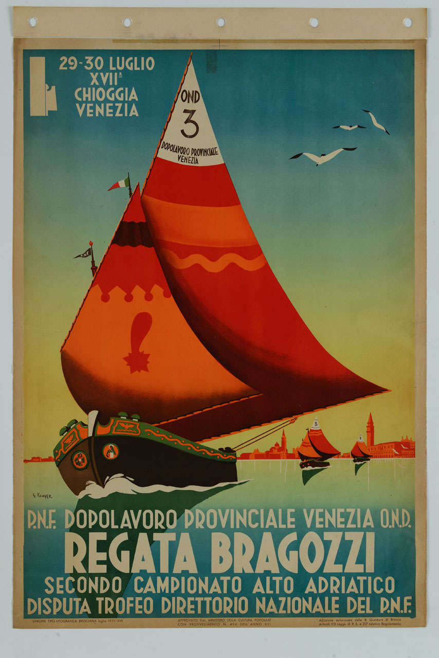 Lettura iconografica: barca a vela; bragozzo; vela latina; bandiera italiana; bandiera PNF; mare; gabbiano; cielo. Categoria merceologica/ tipo evento: sport; gare; vela. Nomi: OND; Organizzazione Nazionale Dopolavoro; dopolavoro provinciale; P.N.F.; Partito Nazionale Fascista; regata bragozzi; secondo campionato alto Adriatico; trofeo direttorio nazionale; ministero della cultura popolare; palazzo ducale; campanile di San Marco; bacino di San Marco; chiesa del Redentore. Luoghi: Chioggia; Venezia; mare Adriatico