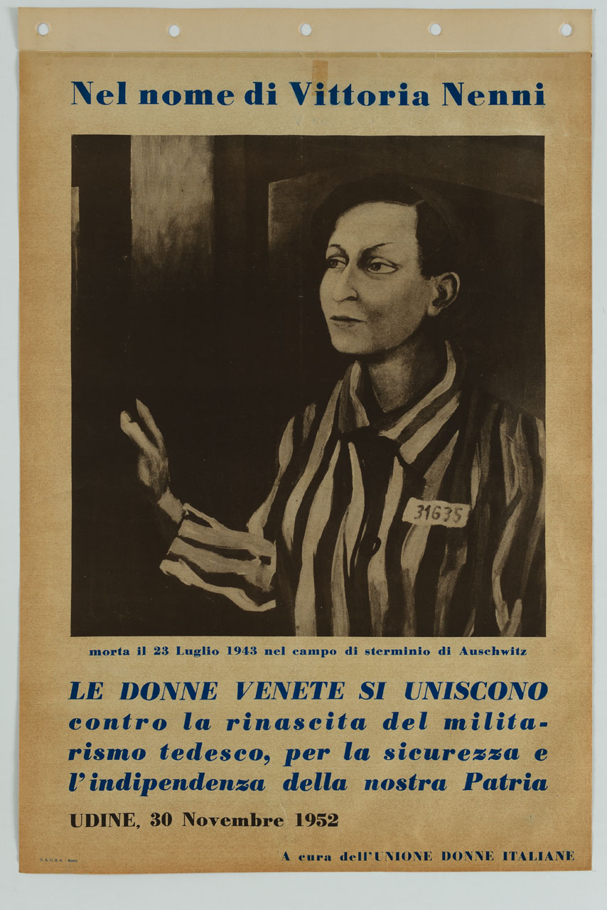 Lettura iconografica: Vittoria Nenni; divisa da deportato; etichetta con numeri. Categoria merceologica/ tipo evento: associazioni sociali; politica; movimenti politici; assemblee; commemorazione; informazione e comunicazione; propaganda politica; propaganda antifascista; propaganda antinazista; guerra; Seconda guerra mondiale; Resistenza. Nomi: Vittoria Nenni; Campo di concentramento di Auschwitz; UDI; Unione Donne Italiane. Luoghi: Polonia; Auschwitz; Veneto; Udine