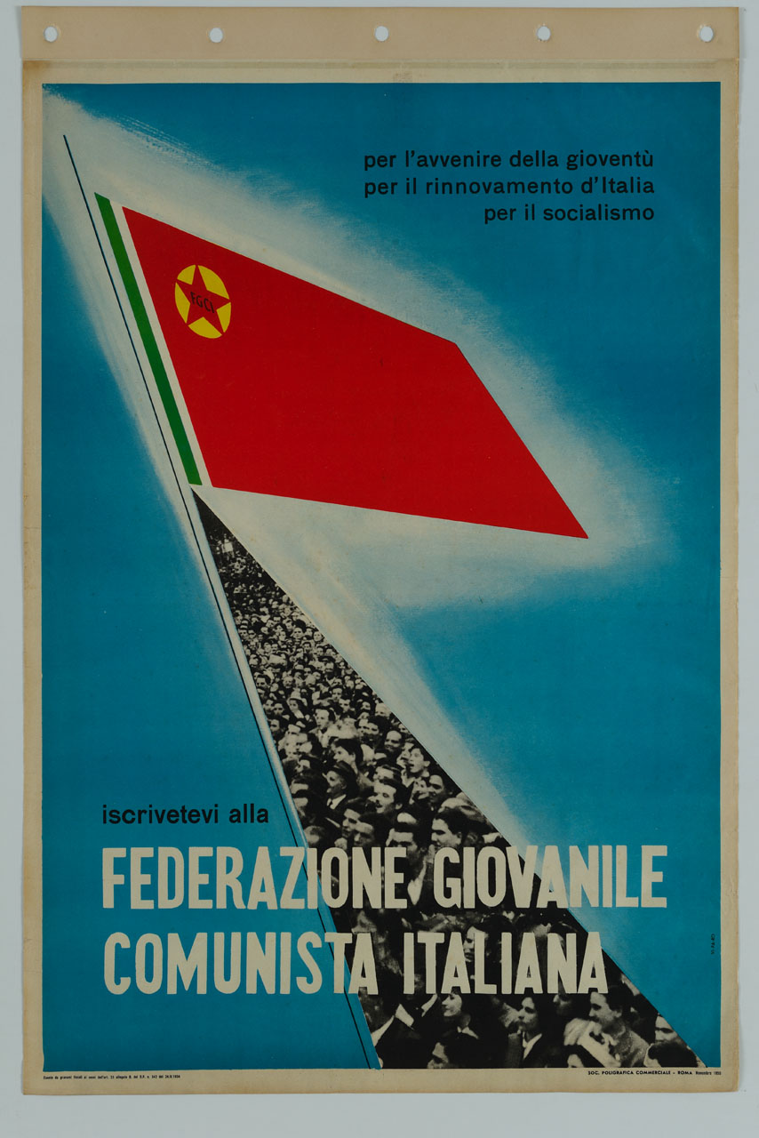 Lettura iconografica: bandiera; folla; figure maschili; figure femminili. Categoria merceologica/ tipo evento: politica; partiti politici; campagne di tesseramento. Nomi: FGCI; Federazione Giovanile Comunista Italiana; PCI; Partito Comunista Italiano. Luoghi: Italia