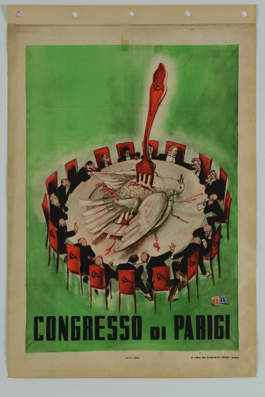 Lettura iconografica: figure maschili; tavolo; sedie; colomba della pace; piatto; forchetta; sangue. Categoria merceologica/ tipo evento: politica; movimenti politici; congressi; informazione e comunicazione; propaganda politica; propaganda anticomunista. Nomi: Congresso di Parigi; Comitato Civico. Luoghi: Roma; Francia; Parigi