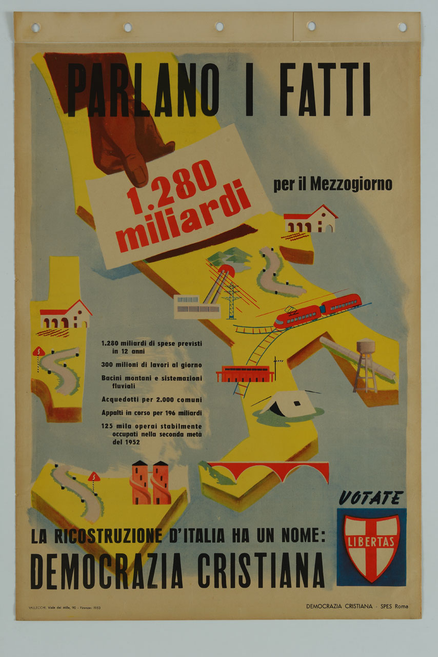 Lettura iconografica: mano; carta geografica dell'Italia meridionale; strade; abitazioni; acquedotto; linea ferroviaria; treni; tenda; centrale idroelettrica; traliccio elettrico; elettrodotto; ponte; fabbrica. Categoria merceologica/ tipo evento: informazione e comunicazione; propaganda politica; propaganda elettorale; politica; partiti politici. Nomi: DC; Democrazia Cristiana; Libertas; SPES; Servizio Propaganda e Stampa; Mezzogiorno. Luoghi: Italia