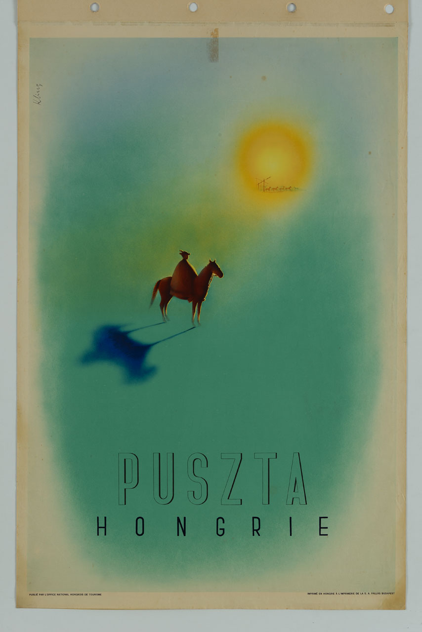 Lettura iconografica: figura maschile; cavallisole. Categoria merceologica/ tipo evento: turismo; steppa; enti di promozione turistica. Nomi: Puszta; Office National Hongrois de tourisme. Luoghi: Hongrie; Ungheria