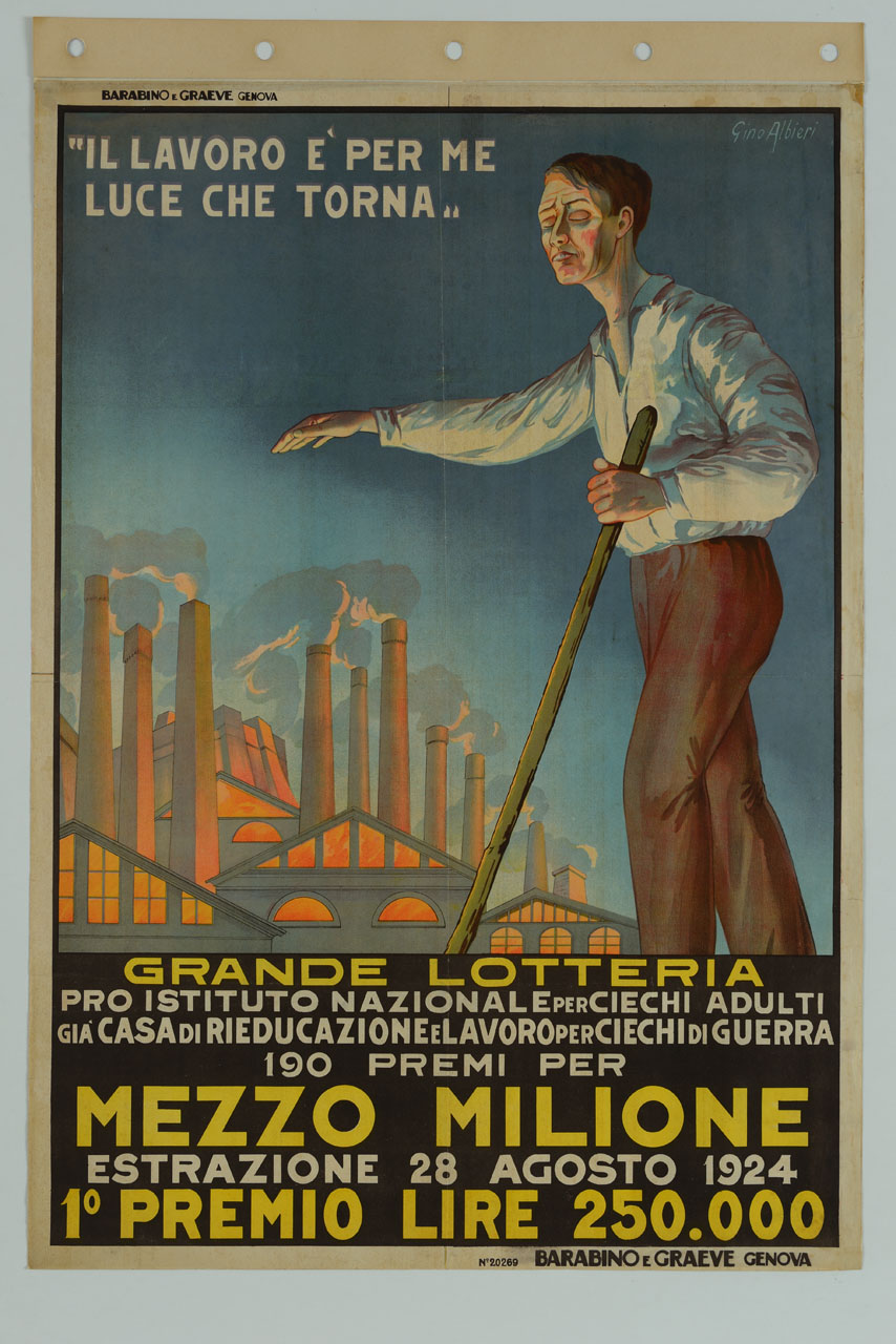Lettura iconografica: figura maschile; cieco; bastone; fabbrica; ciminiere. Categoria merceologica/ tipo evento: tempo libero; lotterie; raccolte fondi; associazioni sociali. Nomi: Grande Lotteria pro Istituto Nazionale per ciechi adulti; Casa di rieducazione e lavoro per ciechi di guerra. Luoghi: Firenze