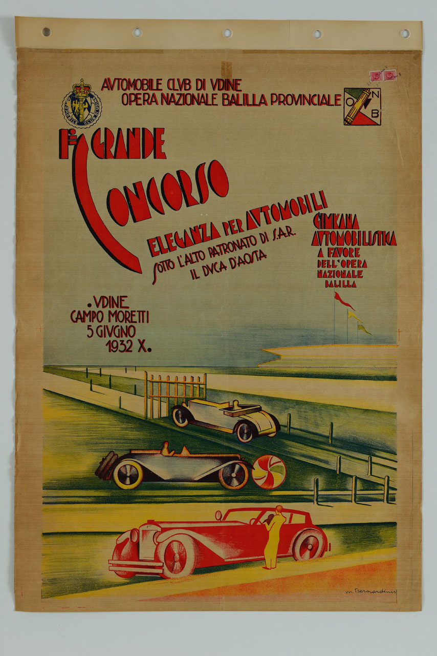 Lettura iconografica: stadio; tribuna; pista; automobili. Categoria merceologica/ tipo evento: industria meccanica; mezzi di trasporto; automobile; concorsi; gare; automobilismo; raccolte fondi; associazioni sociali. Nomi: I Grande Concorso eleganza per automobili; Amedeo di Savoia Duca d'Aosta; Gimkana automobilistica; Campo Moretti; Automobile Club di Udine; ONB; Opera Nazionale Balilla Provinciale. Luoghi: Udine