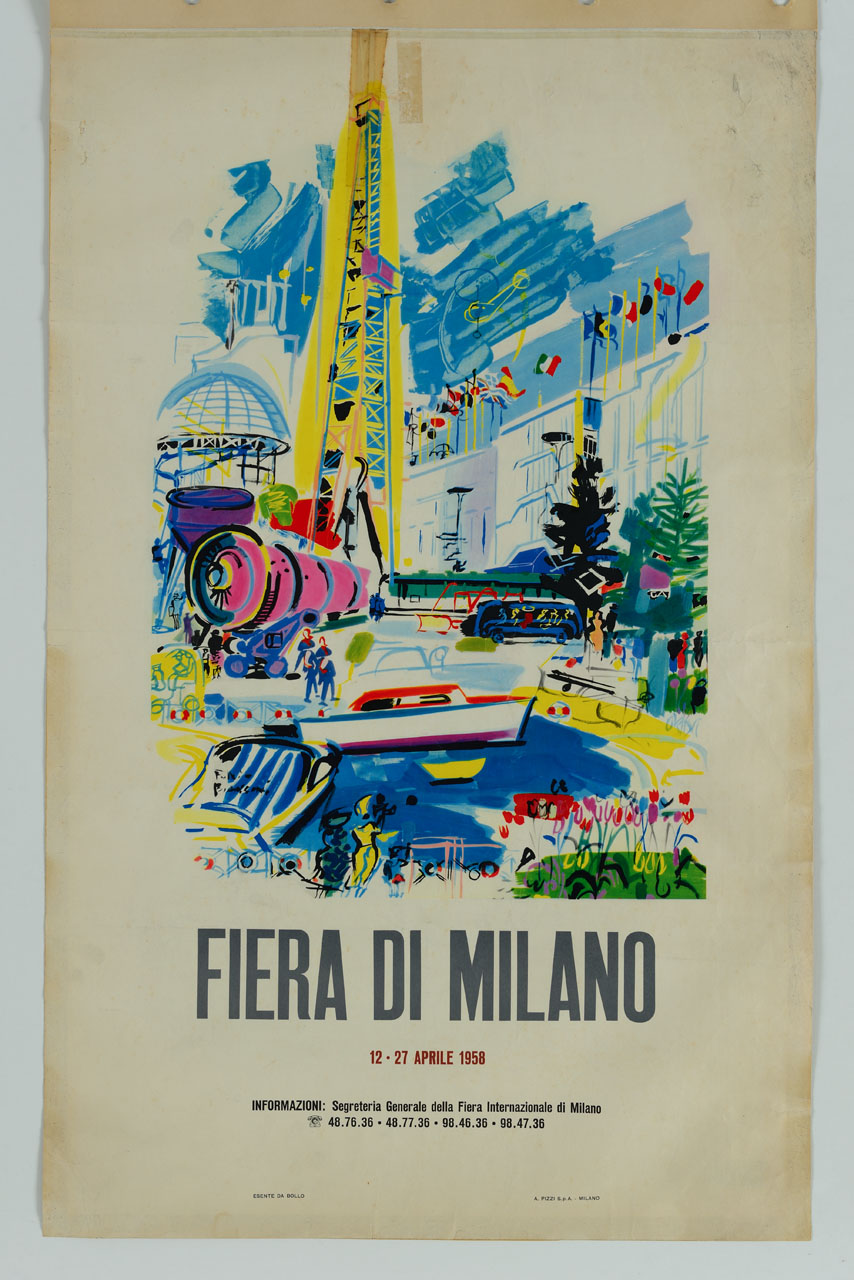 Lettura iconografica: padiglioni fieristici; bandiere; imbarcazioni; figure maschili; figure femminili; mezzi di trasporto. Categoria merceologica/ tipo evento: commercio; industria; artigianato; agricoltura; fiere. Nomi: Fiera di Milano; Segreteria Generale della Fiera Internazionale di Milano. Luoghi: Milano