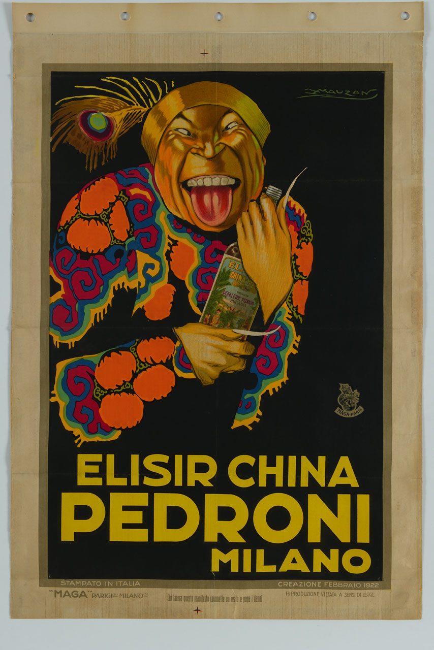 Lettura iconografica: figura maschile; mandarino; bottiglia di liquore. Categoria merceologica/ tipo evento: industria alimentare; bevande; liquori. Nomi: Elisir China Pedroni. Luoghi: Milano