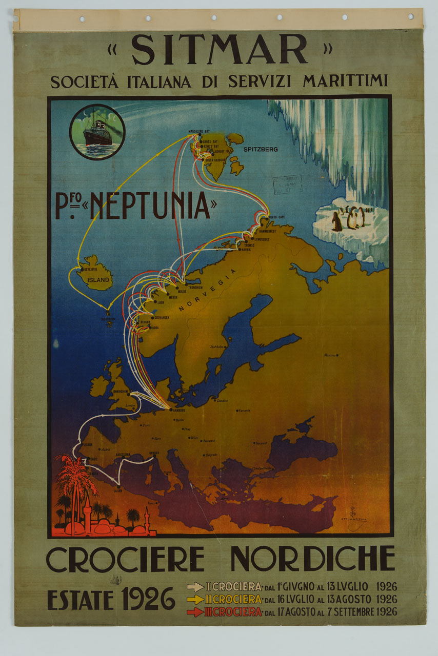 Lettura iconografica: carta geografica; nave; ghiaccio; pinguini; palme; architetture; moschea; cupole; minareti. Categoria merceologica/ tipo evento: turismo; trasporti; trasporto marittimo; compagnia di navigazione. Nomi: STIMAR; Società Italiana di Servizi Marittimi; Neptunia. Luoghi: Genova; Roma; Grecia; Atene; Spagna; Madrid; Barcelona; Barcellona; Cadiz; Cadice; Portogallo; Lisboa; Lisbona; Tunisia; Tunis; Tunisi; Algeria; Alger; Algeri; Marocco; Tanger; Tangeri; Polonia; Varsavia; Danzica; Germania; Berlin; Berlino; Hamburg; Amburgo; Repubblica Ceca; Prag; Praga; Austria; Wien; Vienna; Ungheria; Budapest; Serbia; Belgrado; Romania; Bucarest; Turchia; Costantinopole; Costantinopoli; Istanbul; Regno Unito; Immingham; London; Londra; Russia; Moscow; Mosca; Svezia; Stokholm; Stoccolma; Danimarca; Kopenhagen; Copenaghen; Tórshavn; Norvegia; North Cape; Capo Nord; Hammerfest; Lyngseidet; Tromsö; Narvik; Trondhiem; Molde; Merok; Loen; Gudvangen; Bergen; Odda; Island; Islanda; Reykjavík; Spitzberg; Magdalene Bay; Cross Bay; King's Bay; Advent Bay; Green Harbour