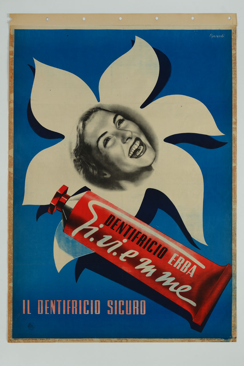 Lettura iconografica: figura femminile; volto; corolla di fiore; tubetto di dentifricio. Categoria merceologica/ tipo evento: industria chimica; igene personale; dentifricio. Nomi: Carlo Erba; Gi. Vi. Emme. Luoghi: Milano