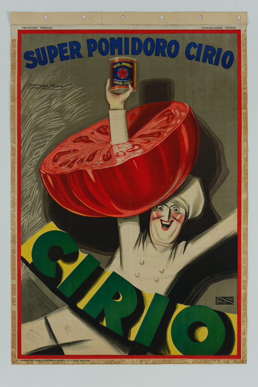Lettura iconografica: figura maschile; cuoco; pomodoro; barattolo di salsa. Categoria merceologica/ tipo evento: industria alimentare; conserve a base di ortaggi; conserva di pomodoro. Nomi: Cirio. Luoghi: Torino
