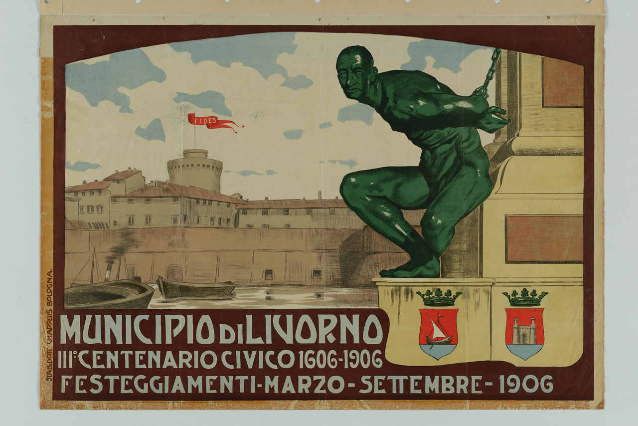 Lettura iconografica: veduta di città; mare; imbarcazioni; architettura; Fortezza Vecchia; vessillo; scultura; figura maschile; monumento dei Quattro Mori. Categoria merceologica/ tipo evento: amministrazione pubblica; enti locali; amministrazione comunale; manifestazioni culturali; celebrazioni; centenario. Nomi: Municipio di Livorno; III Centenario Civico. Luoghi: Livorno