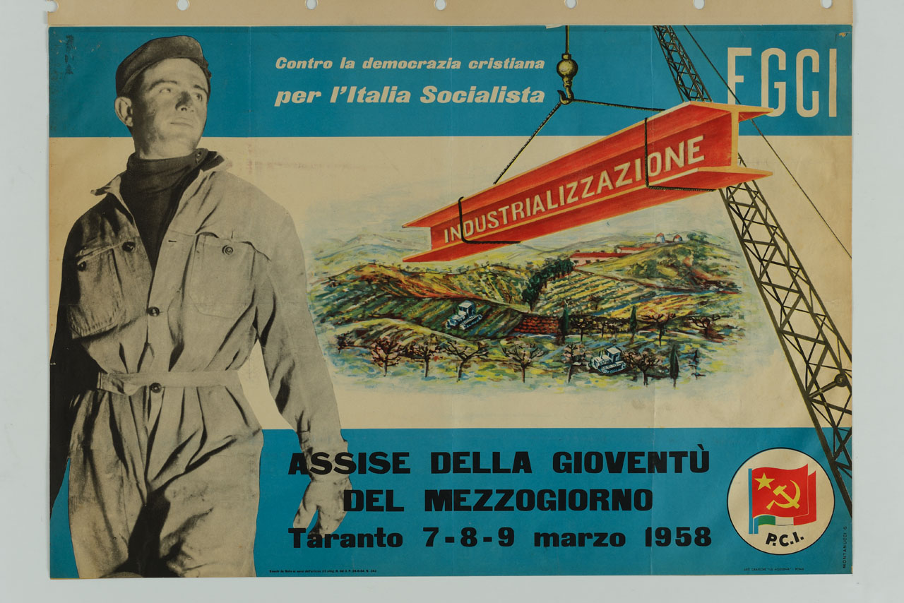 Lettura iconografica: riproduzione fotografica; figura maschile; operaio; tuta da lavoro; trave; gru; gancio; paesaggio collinare; catterpilar. Categoria merceologica/ tipo evento: informazione e comunicazione; propaganda politica; politica; partiti politici; assemblee. Nomi: PCI; Partito Comunista Italiano; FGCI; Federazione Giovanile Comunista Italiana; Assise della Gioventù del Mezzogiorno. Luoghi: Puglia; Taranto